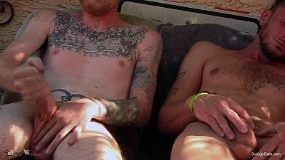 Ginger hipster Dom Ty and tatted white trash superstar Corey Gunz are relaxing in the hot bubbles of an outdoor jacuzzi. The hum of the waterpump makes it almost impossible to understand what they say, but one thing POPS out of the din. Dom Ty is the proud owner of just one ball (but a very big one). Heated up, they lean forward against the hot tub and bend over to show off their three nuts. Tan, studly Corey tries to stroke his two-hander cock with one busy fist, and Dom Ty beats off with that one big ball bouncing and jiggling in its long loose sack.