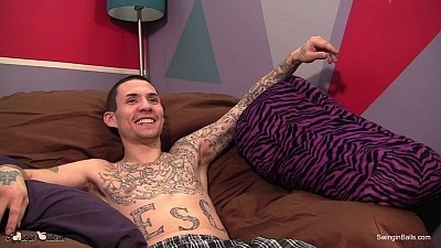 Tough tatted stud Mario Xes is lean with a scruffy little goatee. After posing for a photo kneeling on the bed and letting his long dick hang out of the fly of his briefs, he lies down and starts to beat it. His cock has an intriguing shape, with a large head and a downward curve, and his smooth nuts cling tight to the base.